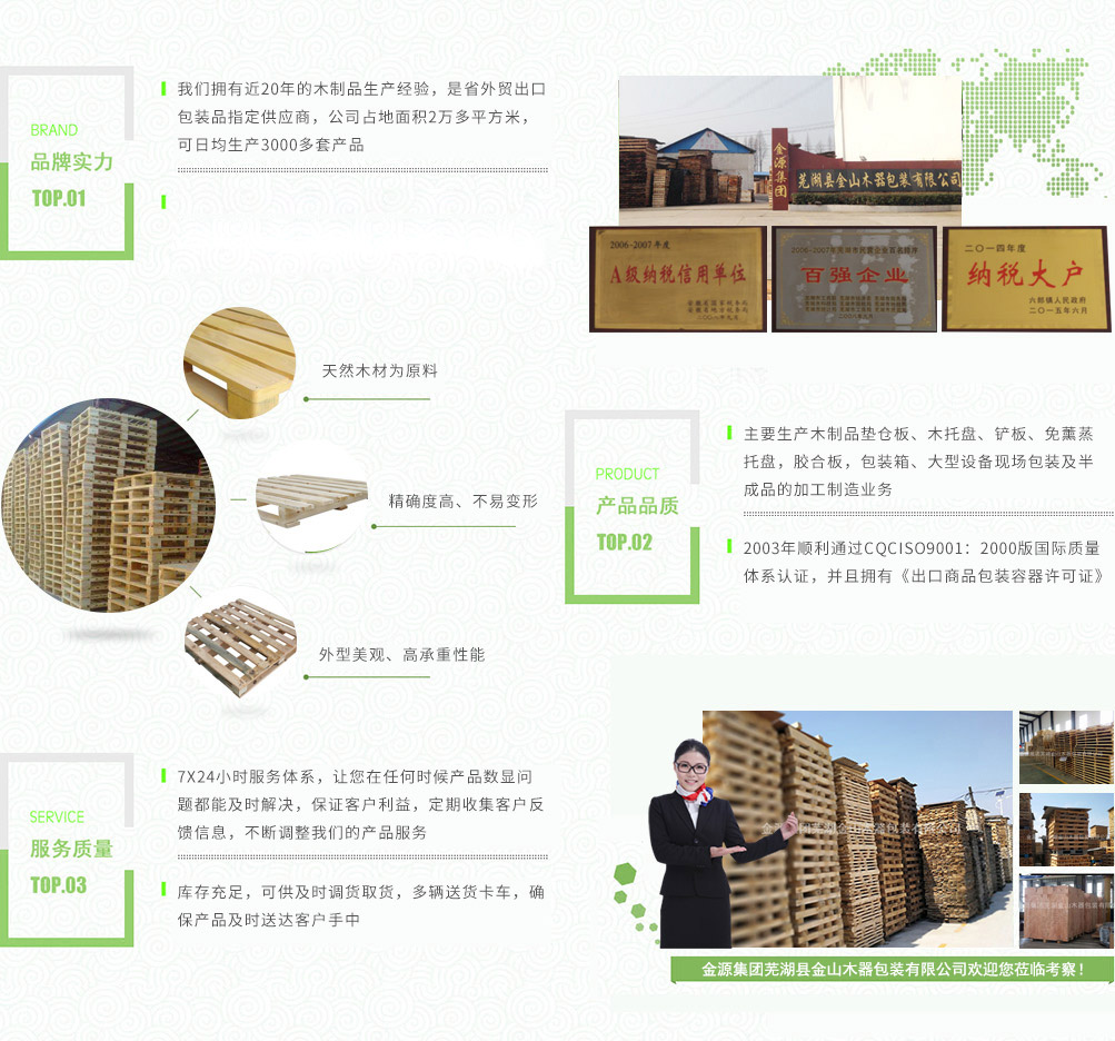 金源集團(tuán)蕪湖金山木器包裝有限公司是省外貿(mào)出口包裝品指定的供應(yīng)商,主要生產(chǎn)木制品墊倉(cāng)板、木托盤(pán)、鏟板、免薰蒸托盤(pán),膠合板,包裝箱、大型設(shè)備現(xiàn)場(chǎng)包裝及半成品的加工制造業(yè)務(wù)。產(chǎn)品廣泛用于物流,倉(cāng)儲(chǔ),港口,碼頭,機(jī)械,建材,化工,紡織,食品,超市,五金電器等行業(yè)。公司占地面積2萬(wàn)多平方米,注冊(cè)資金壹佰壹拾捌萬(wàn)圓整,公司擁有員工160多人,其中技術(shù)人員占25%,可日均生產(chǎn)3000多套產(chǎn)品,年產(chǎn)值6000多萬(wàn)元,公司下轄木材加工廠,組裝廠,并備有大型標(biāo)準(zhǔn)烘房,多功能平板刨,壓刨,挖槽,機(jī)械設(shè)備等。產(chǎn)品主要銷(xiāo)往國(guó)內(nèi)大中型城市并隨貨通行出口國(guó)外。